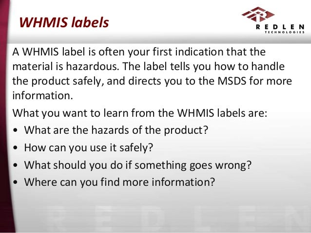WHMIS Labels - Canadian Centre for Occupational Health and Safety Mar 21, 2018 · Labels must identify the precautions to take when using the product and state that there is a Safety Data Sheet (SDS) available with more detailed information. Suppliers, employers and sometimes workers are all responsible for labelling products. There are two different types of labels used in WHMIS: the supplier label, the workplace label. 10 Types of WHMIS Labels and Their Symbol Meanings