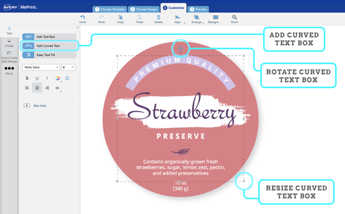 Change the Font Style, Size and Text Colors | Avery.com Change the Font Style, Size and Text Colors In Step 3 customize. On the left-hand side of the page, you will see our Text options, make sure that you select Text. Once you select Text, you will see options for Add a Text Box, Add Curved Text, Easy Text Fill, Font types, Size, Color, Alignment, and Font Styles.